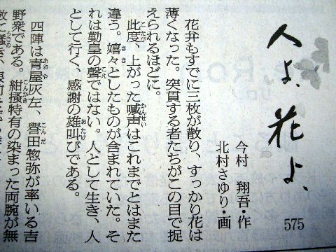 朝刊小説「人よ、花よ」いよいよ最終局面へ北朝との講和の為に戦いを始めた楠木正行の心を知らず、バカな北畠親房が初期の勝利に浮かれて全国へ「北朝を討て」との指令を出し 北朝との全面戦争になってしまった。もう後戻りもできず吉野から逃げるしかない事態に、これで正行の働きはすべて無駄に、破滅へ一直線。 |