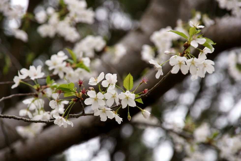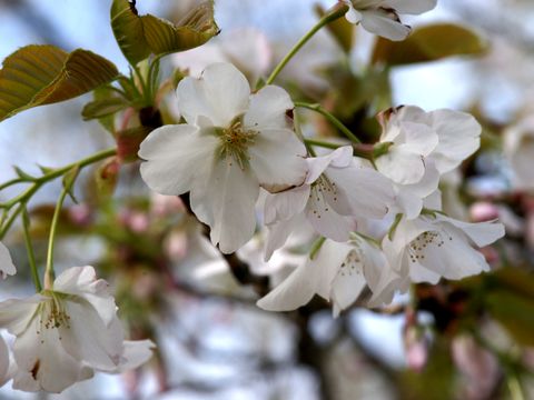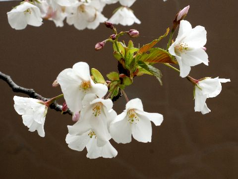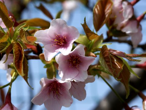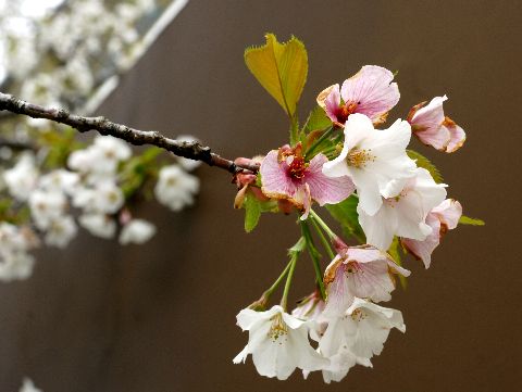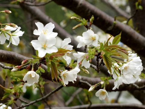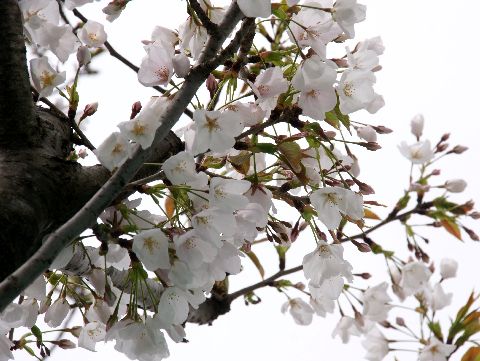 早く咲いた桜では葉も出てきたまだまだ赤く色付いた蕾が多数、開花待ち。 |