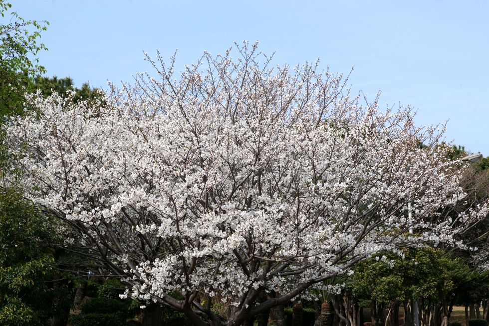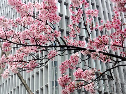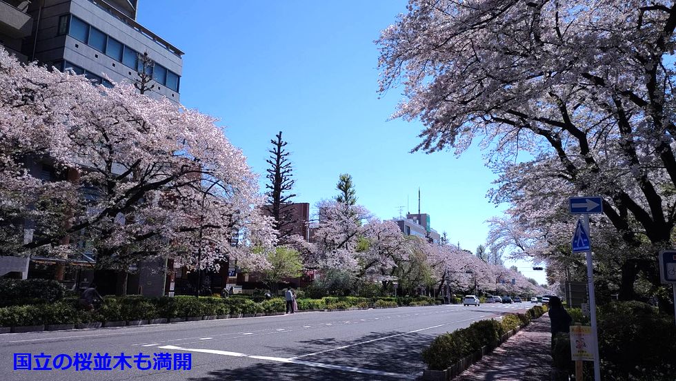 路面には散った花がさすがの強風で一部の花弁は散って路面を埋めている、まだ咲いたばかりの花は持ちこたえているが。 |