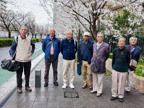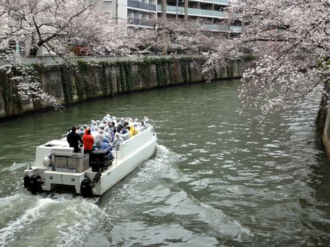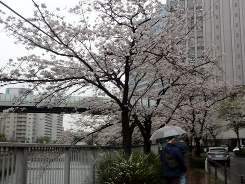 目黒の桜で花見の集い全8名が集まり、目黒駅から川沿いをあるいて大崎駅まで、小雨はやまず。外国人観光客も多い。 |