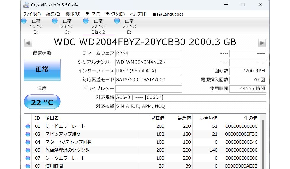 昨日買ったHDDの内容、まあ一応正常だが使用時間が44000時間越え、起動回数は70回なので月一起動のサーバ用だった?Enterprize仕様なので 当然か、普通のHDDを選ぶべきだったのかも。