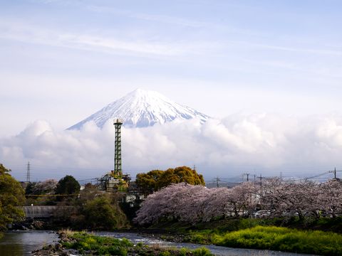 春の富士山雪がどんどん融けて黒い筋の目立つようになった春の姿になった富士山。
