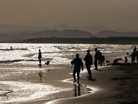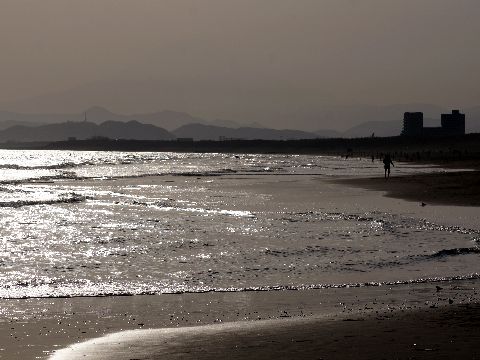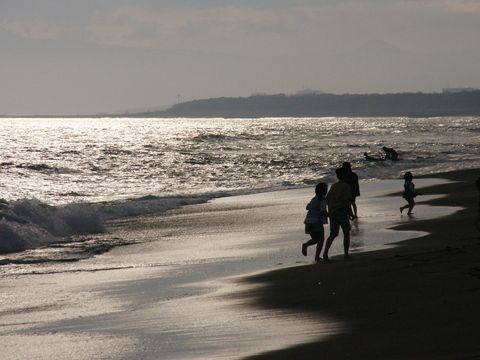 水ぬるむ春で人がたくさん夕方は干潮で遠浅の海は大分先まで浅い状態、子供たちが元気に遊ぶ姿が見られる。 |