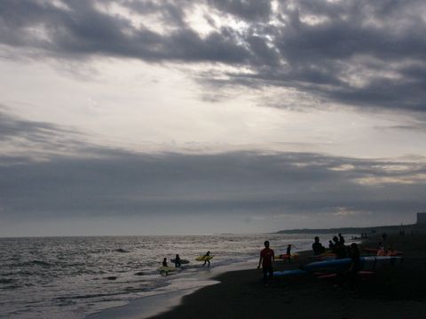 海岸には多くの人が水ぬるむ季節になったせいか子供連れの家族が多数水遊び、子供サーフィンの教室の子供たちも元気一杯。 |