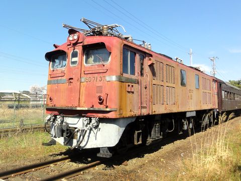 駅前に保存のED71、痛みが激しい交流電化の初期に走ったED71が置いてあるが露天なので痛みが激しく崩壊する寸前の印象も。 並べてある客車は更に痛みが激しく崩壊しそう。 |