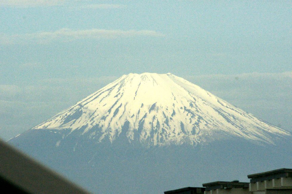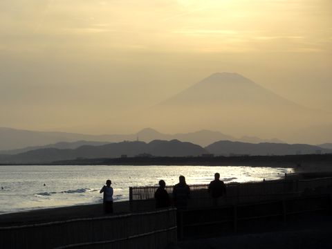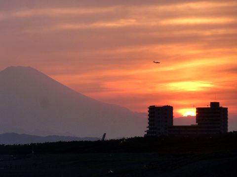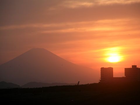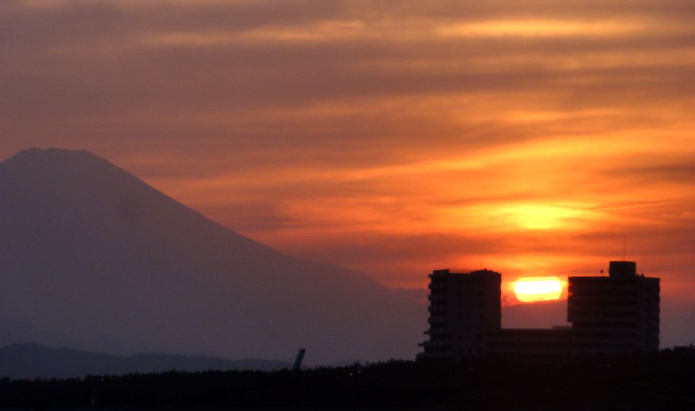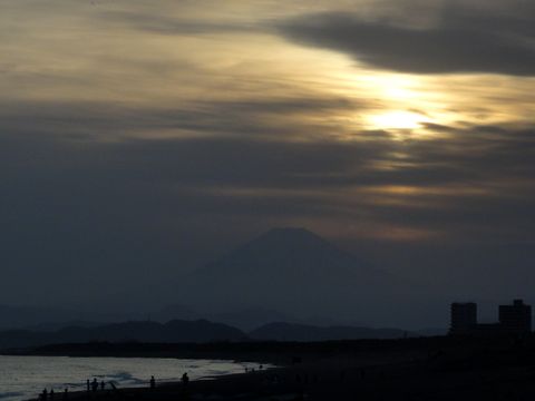 夕方の富士山、雲が多い太陽の位置が高い時間には富士山がうっすらと見えていた、もう沈む位置は随分北へずれている。。 |