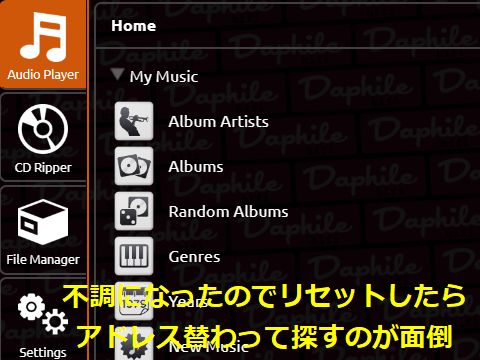 DAPHILEがクラッシュ?リセットして復旧電源断でシャットダウンしたら一部がおかしくなり(ファイル選択画面が出ない)リセットすることに。ネットワークアドレスが 変わって探す手間が掛かる。固定アドレスに戻したがお気に入りやアドインが無くなって再設定が必要に。 |
