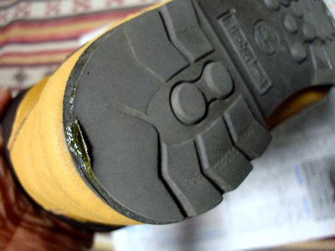 トレッキングシューズ、ソールが剥がれて修理この種の靴は年数が経過するとどれもソールなどの接着部が劣化し剥がれしまう、これまでも補修してきたが踵ソールが剥がれた。 G17ボンドで接着して修復。 |