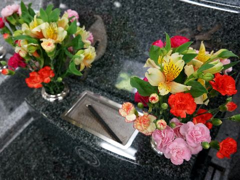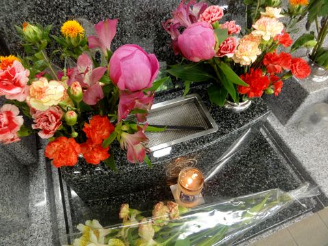 墓参りに:父の命日から3日ここ最近は暖かい日が続いたのだが花は意外に長持ちしていて驚き。芍薬の花があったので買っていった。 |