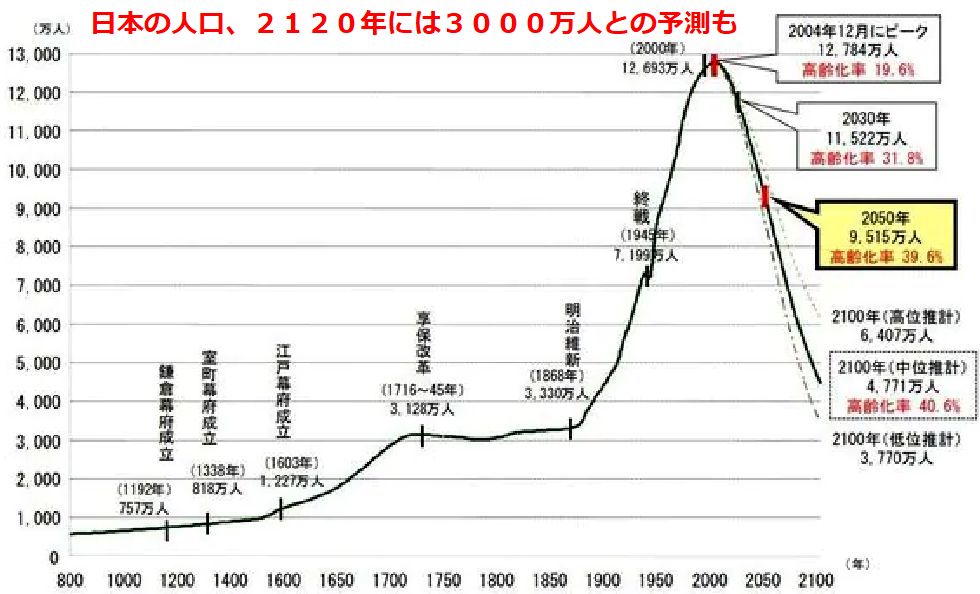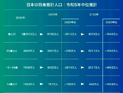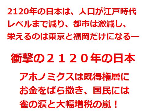 2120年には人口3000万人台へ、江戸時代並みアホノミクスの成果?で人口減少は一向に止められず、先の無い老害政治家が闊歩する政治世界。 |