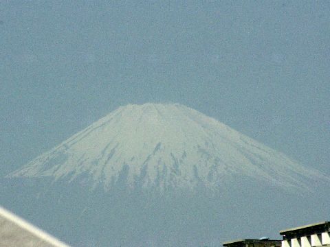富士山はぼんやり筋が段々と太くなり、カスミ空でぼんやりとしか見えないが。 |