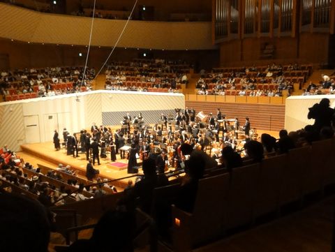 結構混んでいたこのオケは弦楽器の配置が独特、左から第一Vn、Vc、Va、第2Vnとならびコントラバスは第1Vnの後方という ユニークな配置。 |