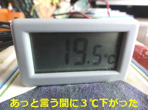 リビング尾のエアコン試運転更新したリビングのエアコン、初めての冷房運転、容量が4KWあるので直ぐに19℃台へ下がった。 |