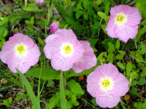 色々な花が咲いている浜昼顔はまだ少ない、路端の昼咲月見草は満開状態。 |
