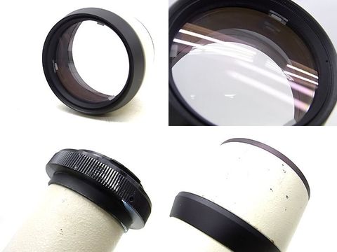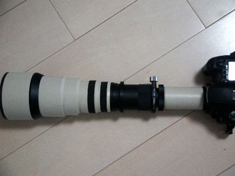 スリービーチ 800-1200mm レンズが届いたサイズは大きいがレンズは3枚なので軽い、オートフォーカスも絞りさえないので軽いのは当然。 Tマウントのアダプタは予想通りCANONのEFマウント用がついていた(他にはNIKON用付もあるよう)。 |