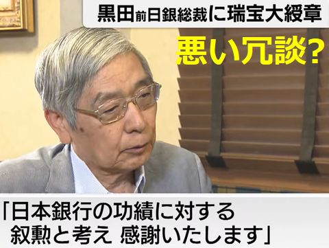 「悪い冗談」としか思えないマイナス金利下で赤字国債を大増発、一部は国民へばら撒いたがその多くは利権団体へと流れ、膨大な借金だけが残った。 急激な円安が進む中で膨大な国債残高で利子支払いが出来なくなるため利上げもままならず傍観するしかない日銀、その諸悪の 根源がこの御仁、まさに悪い冗談。叙勲は相変わらず上位のものは役人や公務員が殆ど、下位レベルに申し訳程度の福祉関係者。 |
