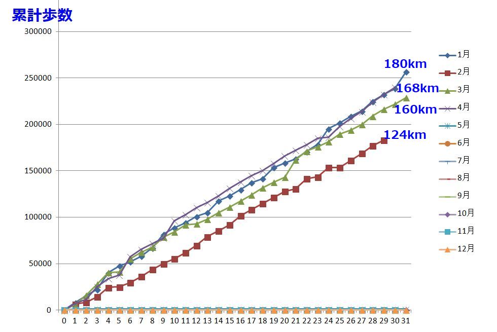 1−4月の歩行記録これを見ると2月は体調が良くなくて歩数も少なかったことが良く解る、まさに健康のバロメータ。 |