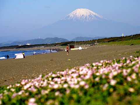 浜昼顔越しの富士山が綺麗帰路、海岸遊歩道沿いの緑地に咲く浜昼顔が綺麗、海越に見える富士山と共に。 |