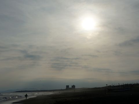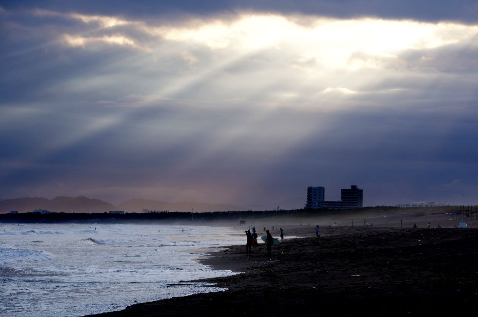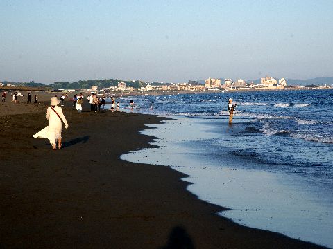 海岸夕景まだ子供連れが結構いる、砂遊びに興じる子供も大人も。 |