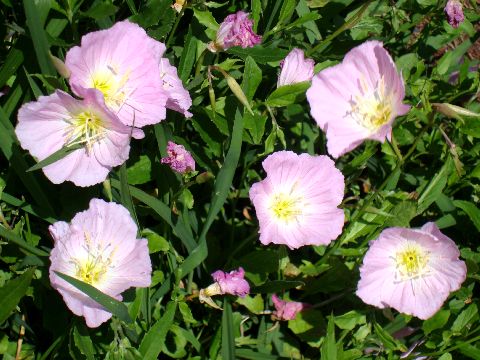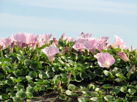 主役は2つ今の時期にあちこちで咲いている、ヒルサキツキミソウとハマヒルガオ。 |