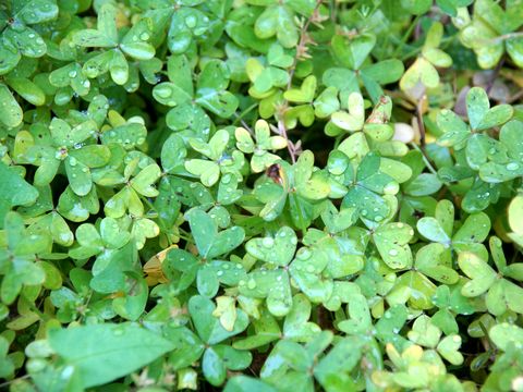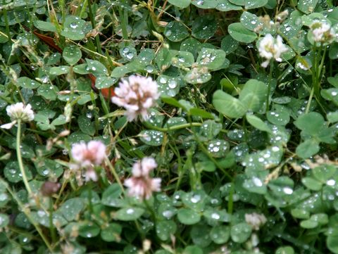 クローバーにも水滴多数風が強く水滴も飛んでいるが地面のクローバーにはまだ残る。 |