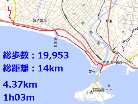 往復歩いて3時間弱健康のために歩いて往復、江ノ島大橋入口まで1時間と少し、トンボロを歩いて対岸へ上陸(仮設のはしごで)。引き返して 復路も歩きで戻った、一部は完全には干上がっていないので濡れる箇所もあり。 |