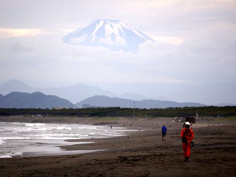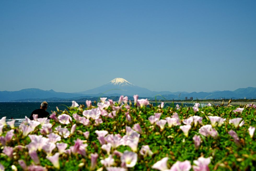 海岸で浜昼顔越しの富士山を撮影