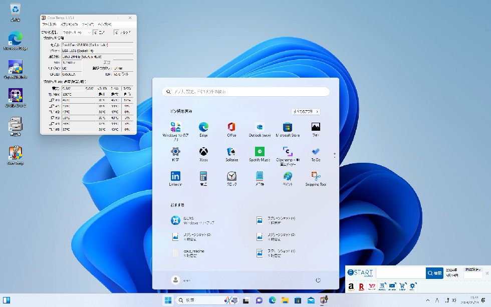 今や見慣れたWindows11の画面Windows10で認証済みだったので問題なくWindows11へアップデート実施できた。 |