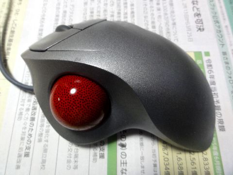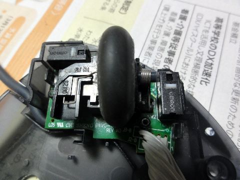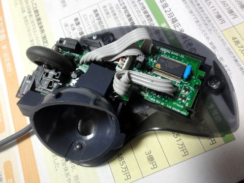 トラックボールが不調で調べる裏面のネジ4本を外して分解、小さな基板が2枚、一枚のスイッチ基板は爪から浮いていた(前回修理のミス?)ので しっかり押し込んで終了、他に特に異常な点もないので組み立ててノートPCで試すが問題なし。 |