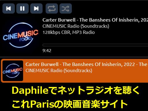 今日は仏のネットラジオで映画音楽をDaphileでは海外のネットラジオも簡単に聴くことができるので、北米や仏の音楽サイトを聴いて楽しんでいる。 これは映画音楽専門のサイト、余計なしゃべりもなく快適。 |