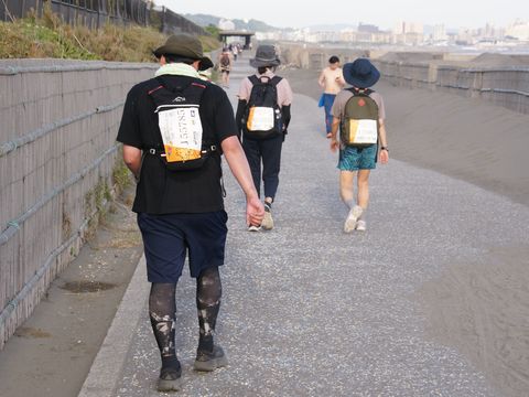 TOKYO EXTREME 100:ビギナーコース35kmメインは100kmで夜通し歩き東京の神宮外苑がゴール、見かけたのはチャレンジコースで小田原城から湘南海岸公園までの35km。 あと2−3kmでゴールへ着くはず。 |
