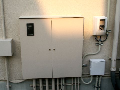 電源工事も実施他の機器の電源と共用が判明し前回常時が中断となったので、今回は電源工事を実施。1階壁面に受電とメータを設置し 屋上まで壁面にケーブル設置。 |