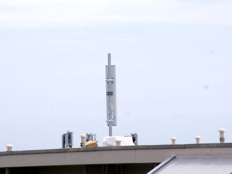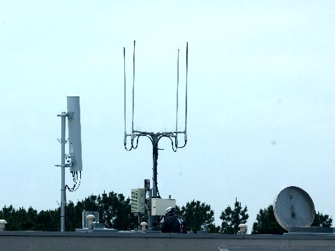 携帯アンテナ交換工事@3号棟これまでのアンテナは4本のポール型だったが新しいものは筒状になった集合アンテナ? |