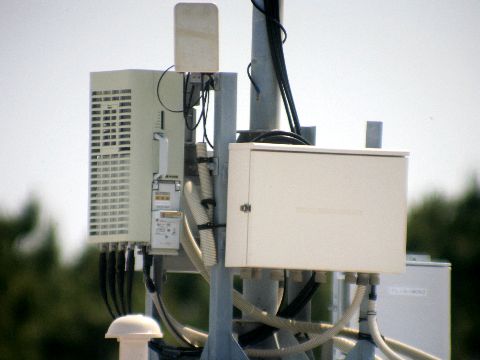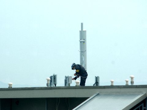 SOFTBANKのアンテナ増設工事、ほぼ終了電源工事がまだ終わってないよう(専用電源を設ける追加工事)で屋上には工事機材の一部が雨除けを掛けて置いてある。 |