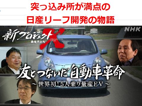 新プロジェクトX:日産リーフ『「かつて」の「部分的な栄光」に焦点を当てるだけの番組を放送し、肩をたたき合って「あの頃は頑張った」と 過去を懐かしむ日本人。この友情物語を「大型ドキュメンタリー番組」として放送するNHK。おいおい…… これでいいのだろうか?という疑問はぬぐえない。』<まさに同感、それでも低迷の日産はどうしたのか、の分析も必須のはず。 |