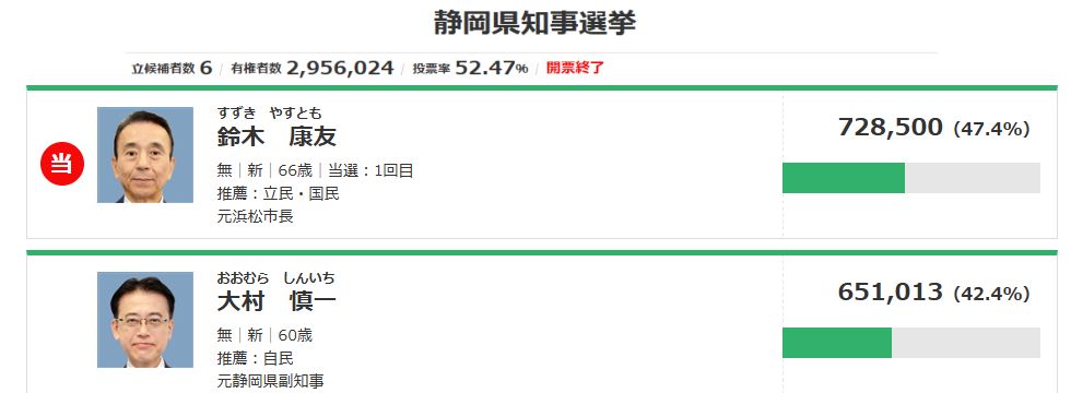 静岡県知事選・予想通りの結果に地域別の投票結果を見ると浜松など西部地区で圧倒的に強かった当選者、でも静岡市では逆転されていたという 面白い結果だった。産業が集積する浜松とその周辺にくらべ、静岡地区は漁業以外の産業がほぼない(大学生の就職先もない)。 |