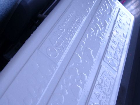 エアコンの上面の水滴対策水滴が付きにくいようにワックスコートのシートで拭いておいたが、大雨の後は綺麗に弾いていて効果大。 |
