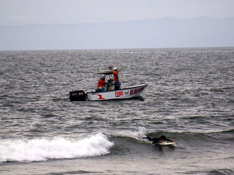 捜索の船も海岸では数人の消防隊員が捜索を見守っていた、海上には捜索するボートが左右に移動している。 サーファーも通常のように多数いるので海岸近くなら直ぐに見つかりそうなもの。 |