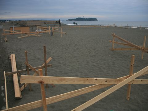 曇り空だが散歩に海の家の場所は整地され海の家を建てる準備が進んでいるよう。排水用の穴も掘り起こして整備済。 |