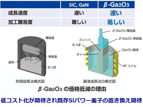 次のパワー素子は酸化ガリウム?今現在は窒化ガリウムGaNや炭化ケイ素SiCが新たなパワー素子の材料として採用が進んでいるがコストの課題は必ずしも解決されていない。 その理由は製造に時間が掛かることや材料の加工難度が高いことによってコストを下がり難いので応用が一定以上は広がりにくい。これに対して 酸化ガリウムは製造時間も短くでき加工難度も低いので従来のシリコン系のパワー半導体を置き換えると期待されている。 |