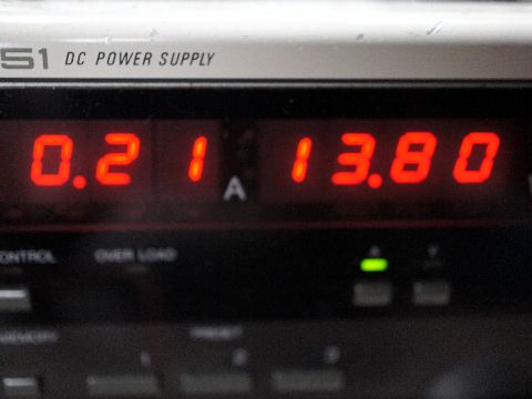 430MHzトランシーバが届いた安定化電源で電圧を定格の13.8Vに設定し通電する、受信・待機時は0.21Aしか流れていない。 |
