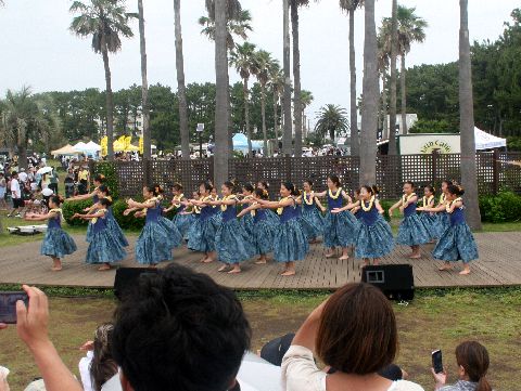 海浜公園のSURF-FESTIVAL 2日目午後1時過ぎから雨がパラパラ、でもフラダンスのチームは元気に踊っている、直ぐに止んだので大丈夫そう。 |