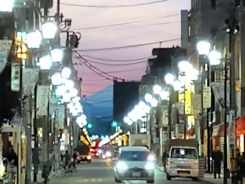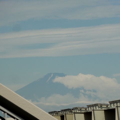 朝の富士山と夕の富士山朝は山頂のみ見えていたが夕方にはほぼ下まですべて見えるように、この時期には珍しい。 |