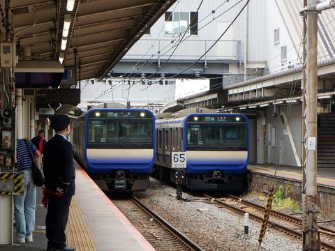 E235系が益々増えてE217系は消える運命長い間主役だったE217系、総武快速線への直通運転で地下トンネル通過があり連結面には非常用の貫通扉が設けられた。 現在はその必要性はなくなりE217系後期車は飾りの扉デザインになっていた。 |