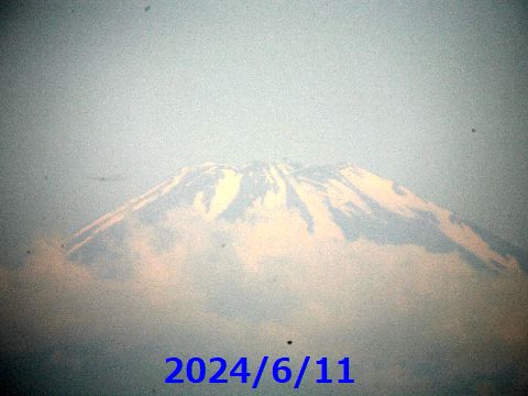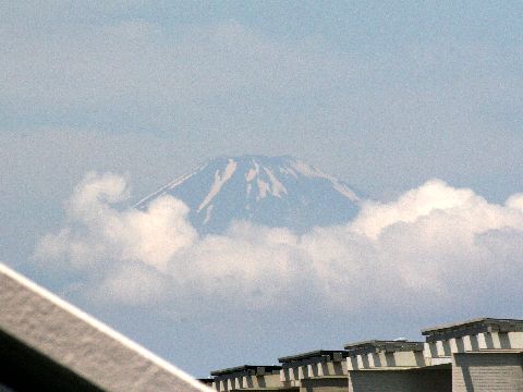 梅雨の近い富士山スッキリ晴れる日は少なくなり富士山も山頂部だけはちょっと見える日が多い。それでもまだ山頂部には雪が残っている。 |