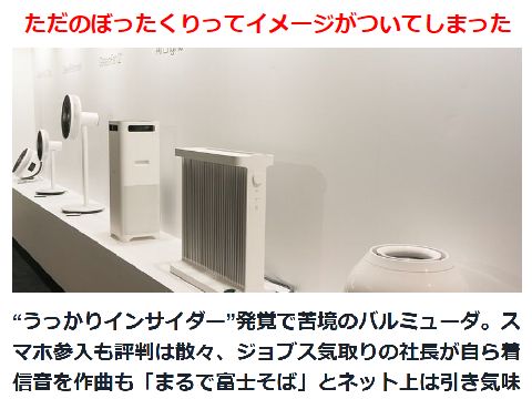 化けの皮が剥がれ苦境のバルミューダ高価なトースタや扇風機で一世を風靡したバルミューダ、躓きはスマホ。これまでのローテク製品をイメージで高く売り 儲ける戦略から外れたハイテク製品へ挑戦して見事大失敗、社長のジョブス気取りも話題になった。 そもそも話題の扇風機でも構造が軟で首折れが多発、デザイン優先の素人設計が露呈した。 |