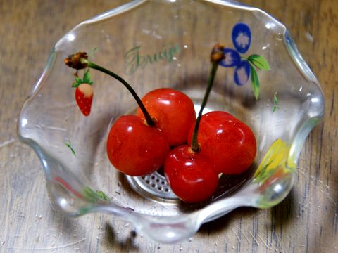 双子のさくらんぼ今年はメシベが出来る時期に高温だった影響でこのような双子のサンクランボが多数できたよう、高温でメシベが2つできたため。 |