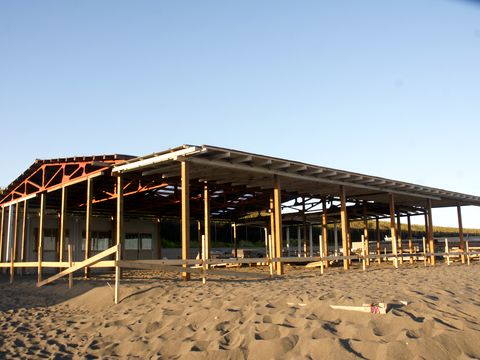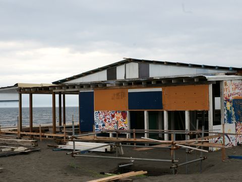 海の家が着々と工事中海の家は7月中旬からのオープンのはずだが準備が早い、手前のプレハブ部は従来は東横にあった監視員小屋だろう。 |