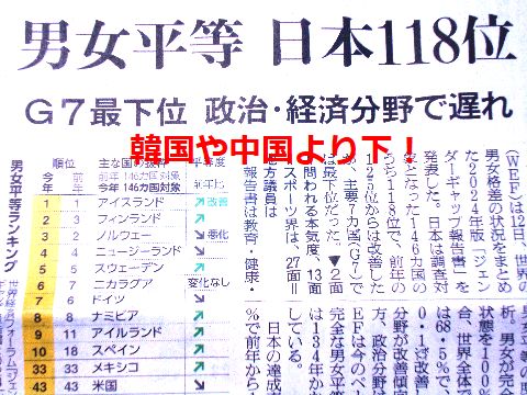 立派な国だ!中国や韓国より下位で恥ずかしくない?何はともあれ人権のない中国やインチキ韓国より下位とは驚き、まあ国会などの現状を見れば当然の結果か、外見は女性だが 中身は男としか思えない自民党の女性議員ばかり、そうでないのは只の数合わせでしかなく。 |