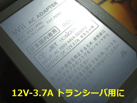 トランシーバ用電源に転用元はNintendoWiiのACアダプタ、ハードオフで110円、出力電圧は公称12Vだが無負荷実測で12.3V。 電流容量は3.7Aあるので十分なはず。いつまでも実験用電源を占拠するのも困る、電圧電流計は中国製の 小さなデジタル表示器を付ける予定。 |